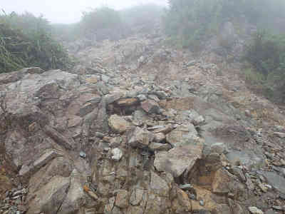 岩の道が続く 急な斜面を登る度に周囲は再び霞始め、明らかに雲の中を歩いていることが解る。ロープを補助に一気に高度を稼ぎ、背後を振り返れば、雲が周囲の視界を遮っている。少しずつ周囲を覆う雲が増えてきたのか、次第に視界が不良となる。霞む視界の中で高度を上げれば、眼下には少しずつ展望が開けそうだ。