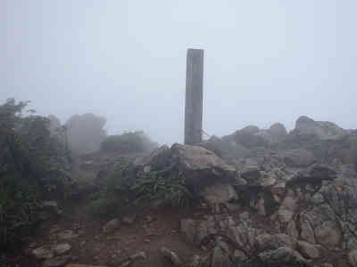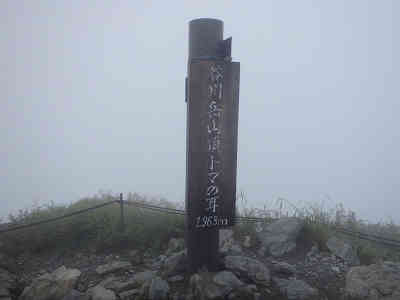 小屋を出発、霧に包まれたまま高度を上げる。左右を笹に囲まれた道を進むと、すぐにトマの耳の案内が立ち、わずかに坂を登ると1963mのトマの耳に着いた。谷川岳の一方の山頂だが、周囲は霧に覆われて何も見えない。次にすこし寄り道をしてもう一方の山頂のオキの耳へ向かう。 一方の山頂 トマの耳(クリックで拡大)