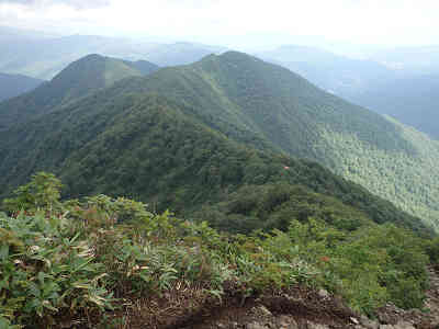 岩場を登り返す 下山の最中には時折日差しが戻り、眼下に広がる展望はやはり美しい。ロープの渡された岩場も下山は楽々で、展望を満喫しながら登山口の天神平へ下り立った。ロープウエイに乗りのんびりしていたら、ロープウエイから下を眺めていた客が熊を見つけた。なんとこんな所にも熊がいることに驚いた。やはり熊除けの鈴は必携である。