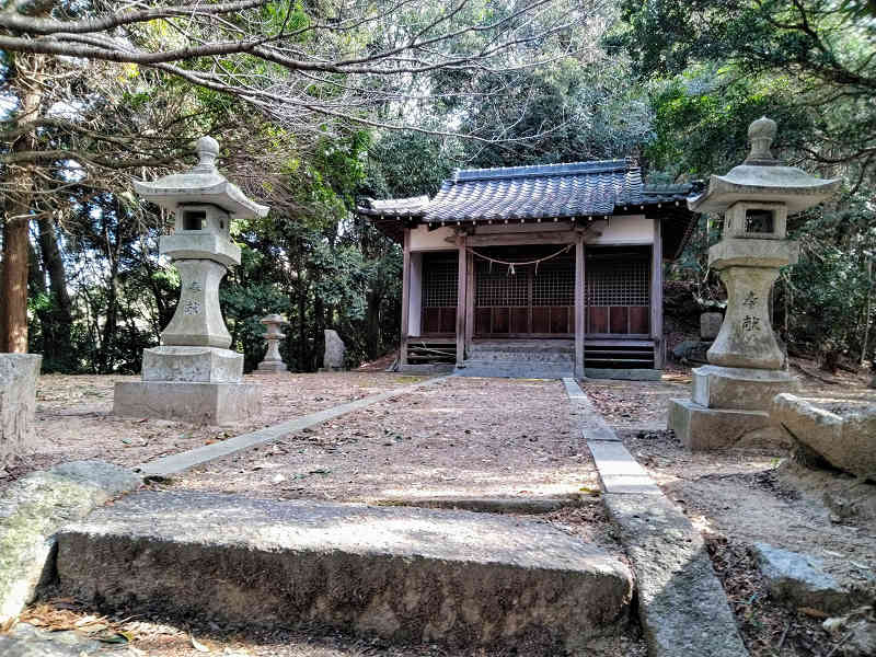 道なりに坂を進み、標高160m付近で進路が南へ変わる。少し進んだところで進路が左(東)に変わると、すぐに石鳥居が現れる。