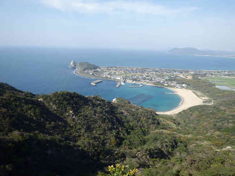 やがて最初のピークに立てば、周囲に360度のパノラマが広がる。眼下にはマリンブルーの海、白い砂が広がり、岩上から東を眺めると、先ほどまで立っていた可也山が端正な山容を見せている。第一ピークを出発し、一旦鞍部へ下って登り返せば第二ピークへ着く。