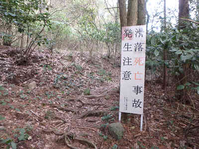 最初は途中の分岐を左側へ行こうと思っていたが、案内には右回りが紹介されていた。そこで掲示されている案内に従い右回りのコースをとることにした。道路を横切り登山道に入る。入口の注意事項にはこのコースがアップダウンのとても厳しいコースであることが記されていた。また、この先には滑落死亡事故発生注意と立て看板が置かれていた。