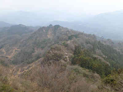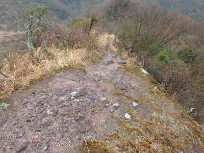 幅の細い岩峰歩きがとても楽しく、このまま何時までも続いて欲しいと思っていたら、熊野磨崖仏まで440mの分岐へ出た。ここで進路は南へ変わり登山口まで690mと案内されていた。分岐を左折し登山口へ向かう。