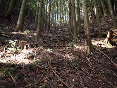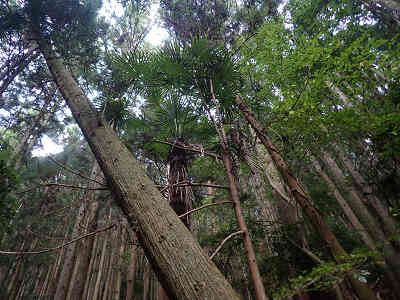 間もなくコンクリート製の人工物を過ごせば、足下に小石などが増えて歩き難くなり、慎重に高度を上げる。シュロの木を過ごすと足下は安定して歩きやすくなり、植林帯の下に続く道を更に進むと、前方に急登が待っていた。