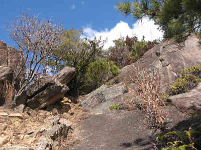 パイン岩(別名クッパ岩) 正面に平岩を見て、左手に背もたれのある岩を過ごすと東に烏帽子岩山が美しい。更に急な斜面を進むと屏風岩と呼ばれる岩の横に出る。この付近は素晴らしい展望地であり、東に聳える烏帽子岩山、瀬戸に浮かぶ江田島、能美島、似島を眺めていると海の青さ、空の青さが目に染みる。