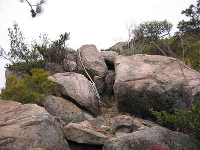眼下には呉ポートピアパークと瀬戸内海 急な斜面にはロープが渡してあり、ロープの助けを借りながら登って行くのも最高の気分。眼下には呉ポートピアパークと瀬戸内海、まだまだ山頂までは岩道が続く。上を見ても下を見ても美しく楽しい岩道が続いている。積み木のように置かれた岩の間に隙間のある場所を過ごし、岩、岩、岩の場所を赤ペンキで描かれた矢印に従って登る。