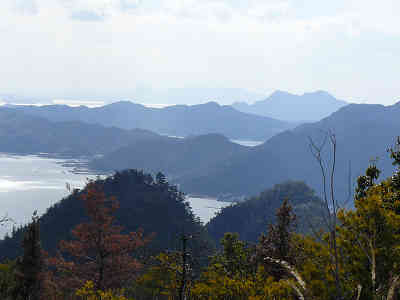 すぐに昼食を終え山頂を過ごして反対側に向かうと、左手に岩場の展望地を見つける。この場所は似島方面を見晴らす展望地で、少し樹林に妨げられるがまずまずの展望が開けていた。更に進んで行くと左手に大きな展望岩があり、この岩の上に立つと周囲をぐるりと見回す事が出来た。南に江田島・宮島・似島、西に広島市街・眼下に小屋浦・北に絵下山・ぐるっと回って東に灰ヶ峰のレーダードーム、素晴らしい展望に感動。昼食を取るには蛙岩かこの大岩の上が最適の場所である。