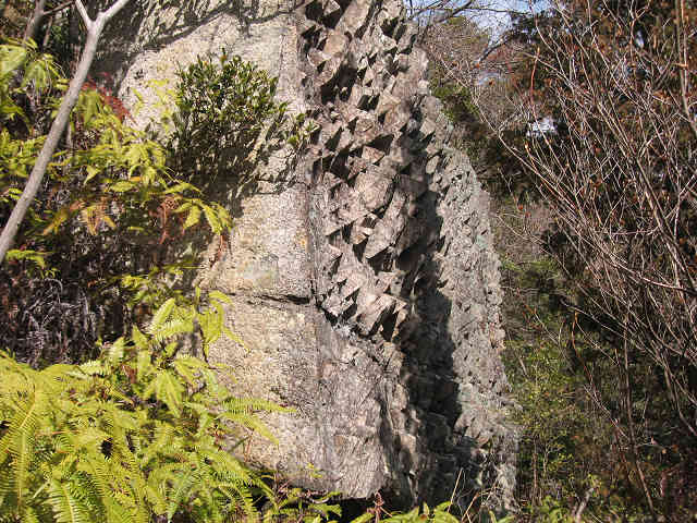 背後に広がる瀬戸の展望を、木の間越しに眺めながら快適な山歩きが続く。と・・・、突然ギザギザ岩が現れた。この岩はパイナップルの房の部分に似ているのでパイン岩(別名クッパ岩)と呼ばれているそうだ。大根摺りに使用する下ろし金のような不思議な岩にびっくり、尖った岩に触れて不思議な岩を観察する。これから先は大きな岩を眺めながら進んで行く事が出来る。
