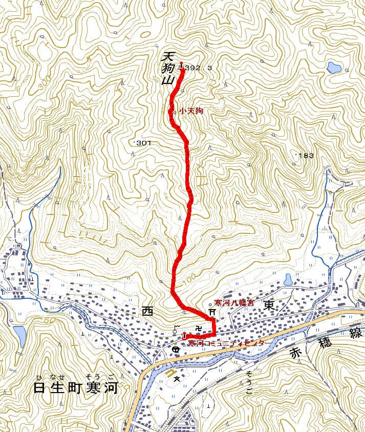 トップに戻る 2015年に登った山リストへ戻る 山名アイウエオ順 2015年1月24日 寒河コミュニティー →0:30→ 頂上まで1.2km地点 →0:40→ 山頂 →0:45→ 寒河コミュニティー 全歩行時間 1時間55分 山と渓谷社の分県シリーズ「福岡県の山」の登山が今年初めに終了、今年は同じく分県シリーズの「岡山県の山」、島根県を中心とした「出雲の山々とその周辺」の2つの本の完登を目標にしている。 岡山県の山は10年くらい前から登り始めており、最初の目的は「中国百名山」完登、次は「中国地方の山百選」完登、そして残りの山へ登ろうと思い始めたのは2013年の年末あたり。ところが、昨年2014年は「福岡県の山」の完登を優先したため、残り20山から停滞していた。 この20山は、真冬に雪の影響が予想される中国山地の山が15山、比較的瀬戸内海に近い山が5山という構成である。今回は真冬の遠征となるので、瀬戸内海側の5山を2日間で登る予定にしている。 遠征初日の最初の山は備前市日生町寒河(そうご)にそびえる天狗山、ガイドに寄れば、江戸時代中期から大正時代まで、旗振りによって大阪堂島の米相場を全国に伝える旗振り通信が行われていたそうだ。それだけ山頂付近からの展望が素晴らしいと言うことだろう。