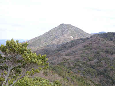 大岩の横を通って高度を上げれば右から正面登山道が合流する。少し正面登山道側へ立ち寄ると、岩上からは矢筈山から防府大平山へ続く山並み、海に突き出た江泊山、眼下には防府市街、その先に山頂にアンテナの建つ錦山、桑山や田島山など素晴らしい展望が広がっている。