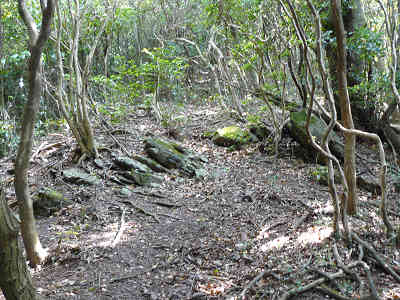 やがて作業道上に草が被り始めるが、この付近までは小型の車両で進入することができそうだ。左に植林帯を見ながら進むと、崖崩注意の場所を過ごす。左下には石組みが残っており、この付近には昔の生活の跡を見ることができる。