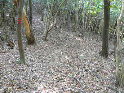 この堰堤を過ごしたら左側に注意が必要で、すぐに左への分岐を見つける。但し、草の被る時期だと進行方向には目印を見つけにくいので要注意。この入口を見過ごし、コンクリート舗装をされた急な坂を登ると、平成14年度に整備された堰堤が左側に現れる。ここまで来たら明らかに行き過ぎなので引き返すこと。