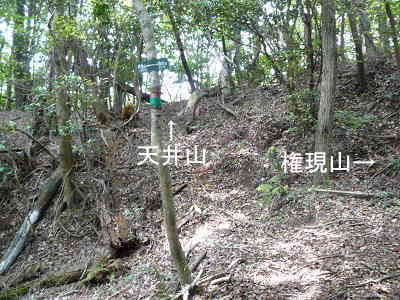 登りが急だった分、下りは早く、一気に峠まで下り立った。次は天井山へ向かう。峠の案内には権現山へ30分、天井山へ1時間と書かれている。天井山への案内に従い進むと、進路は右(西)方向へ変わる。