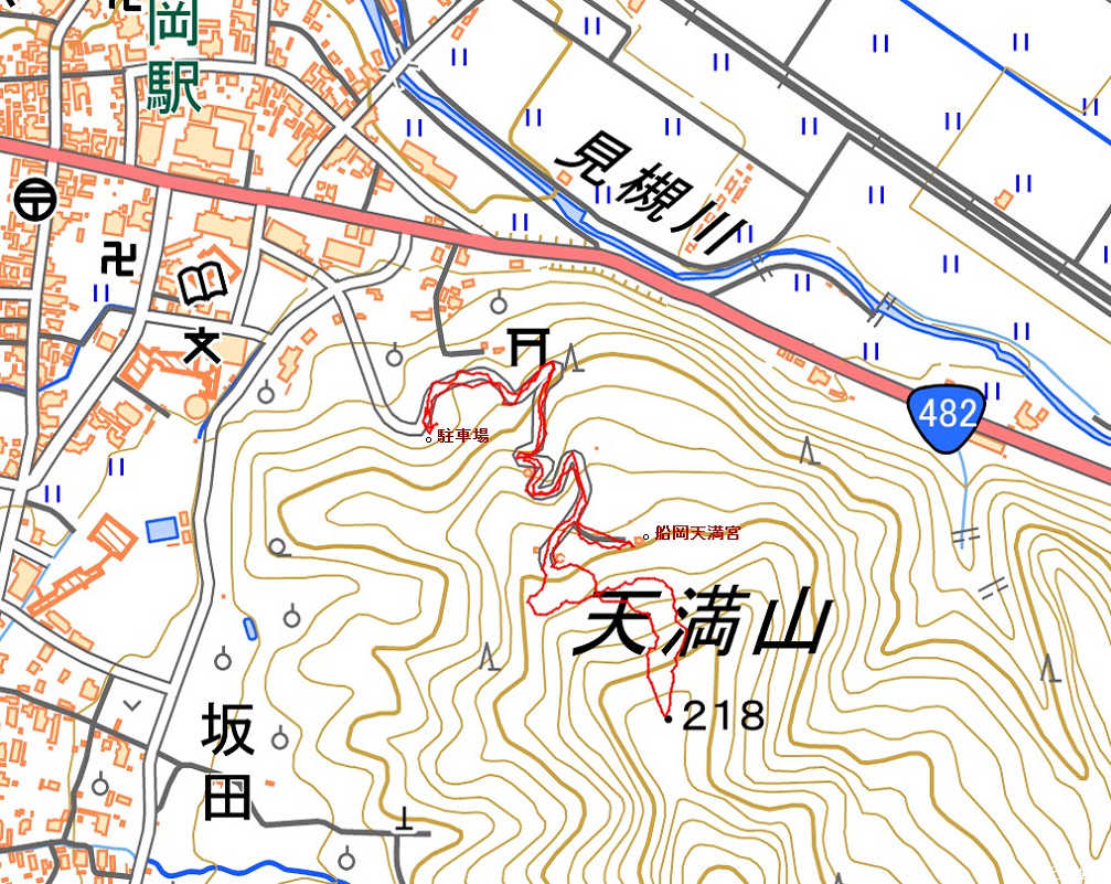 鋪装道を進むと左下に建物が建っていた。これは上船岡神社である。さらに進むと右に貯水施設を過ごし、九十九折れの鋪装道を進めば左に広く平坦な天満山公園が現れた。