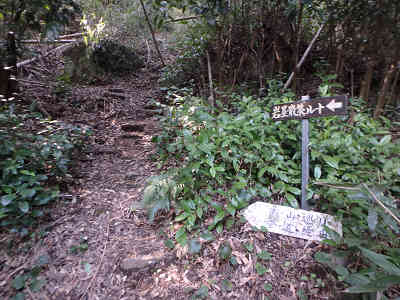 今度は真っ直ぐ下へ向かって下るのだが、鎖が渡されているので比較的安心して下ることができる。息つく間もない感じで鞍部に下ると、ここは三叉路となっており、左は岩屋散策ルート、下へ続く道も岩屋散策ルート、右は無明の橋へ続くようだ。そこで今回の目的地、無明橋へ向かって右へ続く道を採る。