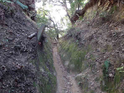 平坦な3合目から5合目付近 道の中央部が深く掘られたような、左右が土壁状態の道を進むと、平坦な尾根道の先に三合目、四合目、五合目の歌碑を過ごす。このあたり、周囲は自然林なのでとても気持ちのよい遊歩道である。