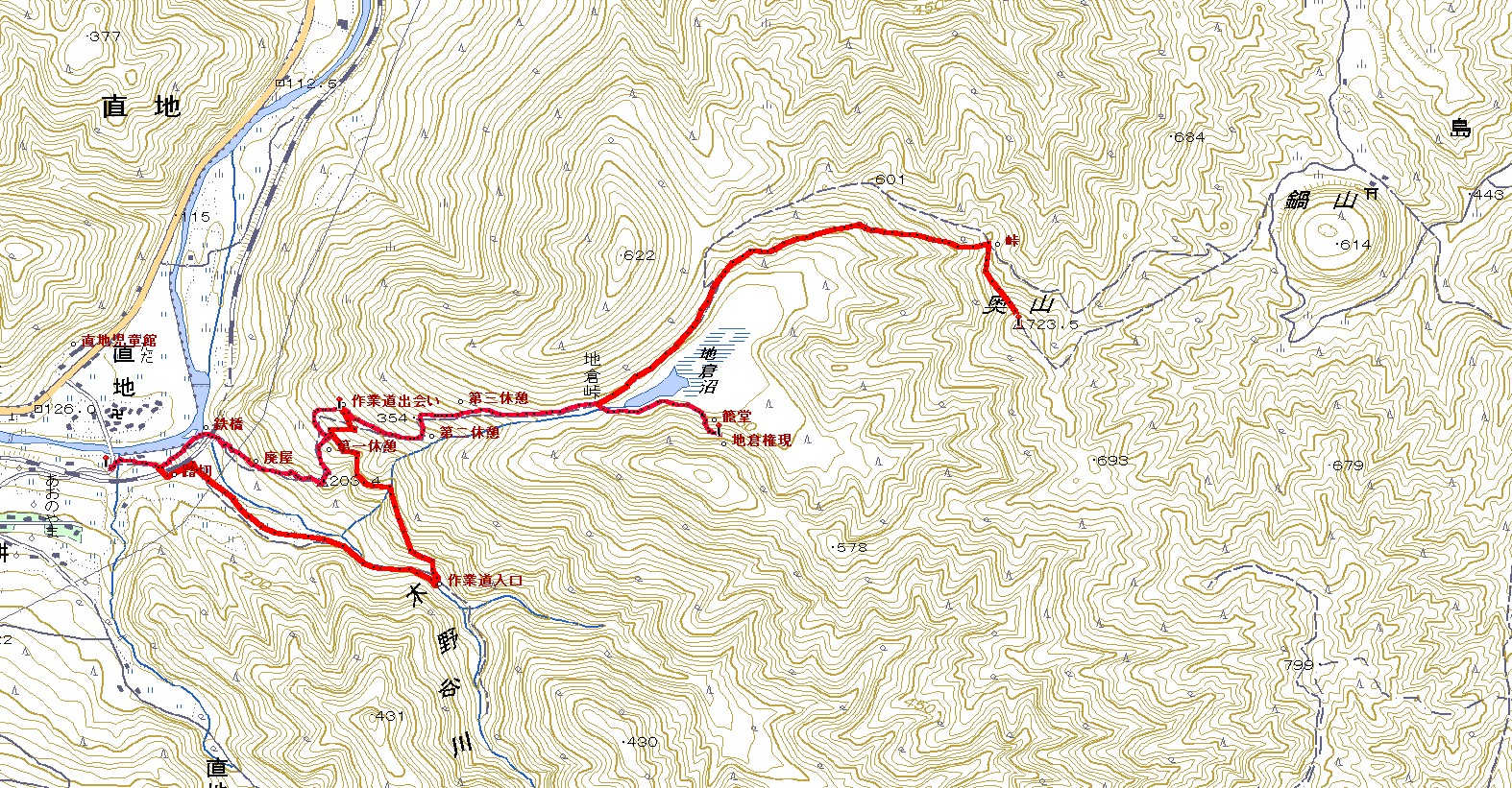 少し坂の傾斜を感じ始めると、地倉沼と島地区の中間点に位置する峠へ到着、地倉峠からは35分の行程である。峠には休憩用のテーブルとベンチが置かれており、この場所は奥山への分岐点でもある。ベンチに腰掛け遅めの昼食、久しぶりにカップヌードルを食べる。