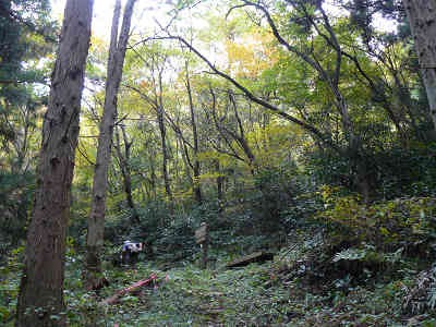 急な斜面を下り、祠岩を再度眺めてべンチの置かれた自然歩道まで引き返す。そのまま地倉峠を経由、作業道を交差しながら下り、作業道別れの場所からは作業道を辿って下りる。この季節には、作業道から向かいの山々に紅葉が美しく、特に青野山が大きい。