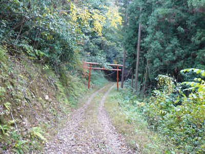 緩やかな作業道を下れば、作業道別れからは20分で朱の鳥居の建つ作業道入口へ到着。入口には、千倉権現総代より「この道路は公道では有りません 通行は自由ですが 落石。事故等の責任は一切負いません」と書かれている。この先で本来の直地地区から続く林道と合流する。