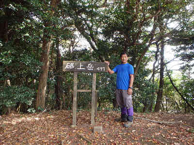 更に登山道を辿れば、頂上へ向かって左右の分岐があり、左は頂上まで180m、右は急な坂を150mと案内されていた。わずかな距離の差なので、ここでは左の道を採る。間もなく頭上を覆っていた樹林が切れ、本登山中初めて頭上が開けた。目の前には草原の斜面が現れ、石段を登れば石組みに囲まれた武宮へ到着した。
