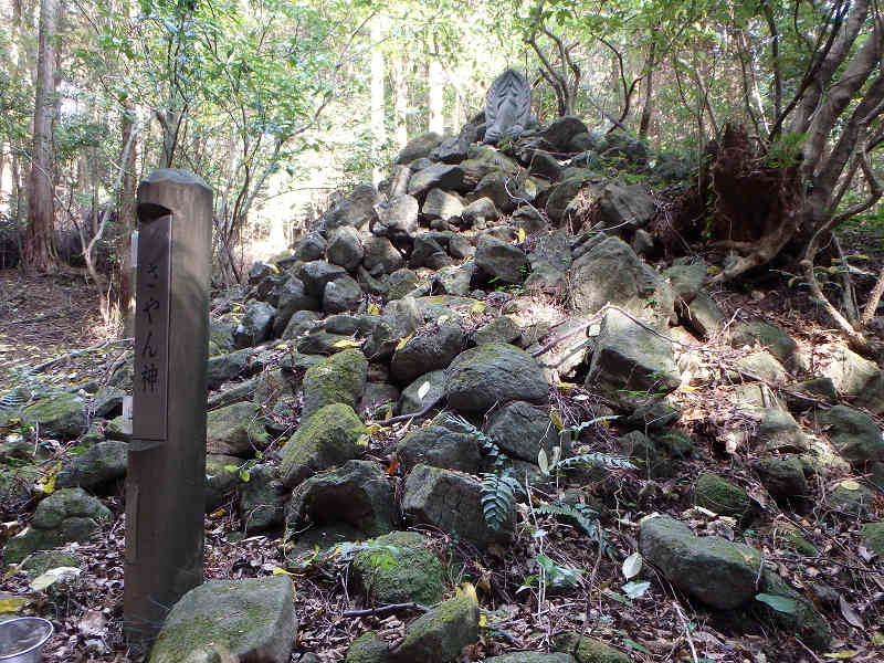 さやん神 広く平坦なみそぎのはるを出発、岩の目立つ道に向かえば、少し坂の傾斜が増し、周囲には自然の雑木が増えてくる。間もなく前方に石の積み上げられたさやん神が見えてくる。積み上げられた石の頂上には、陰陽石の陽石が祀られており、子孫繁栄を願って置かれたものだろう。