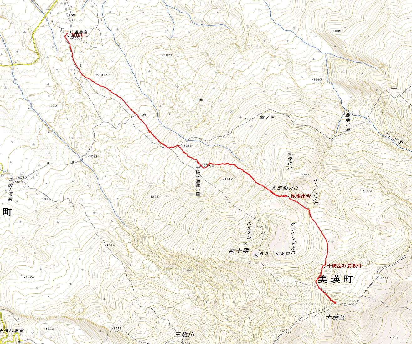 →0:40→ 山頂 →0:25→ 十勝岳の肩取付 →0:25→ 尾根出合