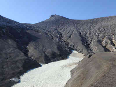 眼下には雪渓、向かいには美瑛岳が美しい。背後には前十勝岳の噴煙が間近で、硫黄臭の原因でもある。さて、十勝岳へ向かって砂礫の道に入る。踏み跡が確かなので景色を眺めながら高度を上げれば大丈夫、時の経過と共に変わる景色を堪能していれば、最後の岩場を一登りで十勝岳の山頂へ着いた。