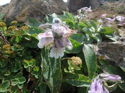 足下には多くの花が咲いており、足場は悪いが慎重に登れば大して問題は無い。間もなく登山道に朝日が差し始め、明るい道を快調に進む。進路上の石には黄色のマーカーが要所に塗られており、進路を確認しながら高度を上げる。