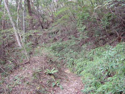 道はシダに覆われて少しヤブ加減だが、概して歩きやすく、緩やかな坂が続いている。六丁の丁塚と石仏を見ると少し急坂となり、登山口から30分で「狗留孫山霊場に入る」の石碑を抜けた。