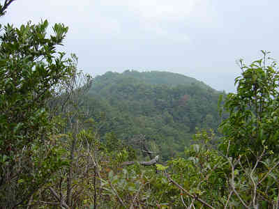 狗留孫山山頂を出発し544mの鷲か嶽山頂三角点を目指して一旦尾根を下る。鬱蒼とした藪の中に入って行き、展望もなく暗い道を進んで行くと鷲か嶽の山頂方向を確認することができた。
