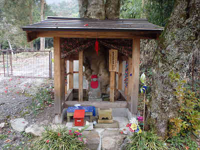 登山途中に鑑賞する2本のしだれ桜 間もなく右に椿の木がそびえており、その下には生木地蔵が祀られている。昔、この椿の根元は二本に別れていた。その間に仏像(40cmくらいの石像)が置かれていたが、木が大きくなるに連れて仏像を包み込んだ。よってこの木を生木地蔵と呼んでいるそうだ。家内安全、交通安全、無病息災を願い、多くの人が信仰していると案内されている。なお、この地蔵様は平成24年9月に改装されている。