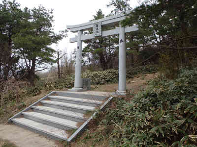 熊野権現社へ参拝し、整備された擬木の階段を下る。遊歩道の左右には珍しいちまき笹の群生地が広がっている。やがて山頂から続くもう一方の遊歩道と合わさり、平坦な笹原につけられた道を西へ進む。白い馬酔木の花を観賞しながら坂を下ると、平成20年3月に建立された大鳥居の前に着く。