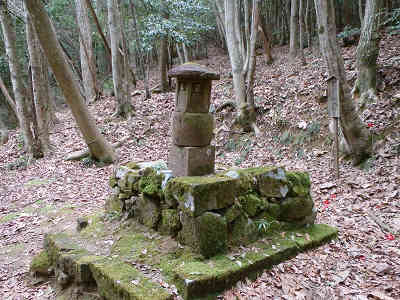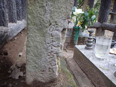 剣豪 佐々木小次郎の墓 更に案内に従い進み、小次郎の墓へ参拝。小次郎慕古の会の案内によれば、小次郎は慶長17年(1614)4月13日巌流島の決闘に破れた。その当時妻のユキは懐妊中であったが、切支丹の信者で折柄の厳しいキリスト教の禁令のため、夫の遺髪を抱き、多くの信者とともに安全な居所を求めて山陰の地に逃れた。