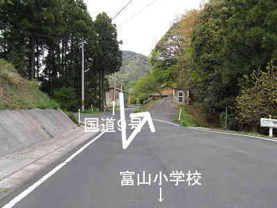 出雲市立田儀小学校を右に過ごし、そのまま道なりに富山要害山へ向かう。やがて出雲市から大田市に入り、この市境から道なりに約2.5km進むと、左側に「要害山0.8km ←駐車場」の案内が立っている。