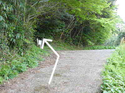 駐車場を出発、左に炭焼きの施設を過ごすと、左に杉の植林帯、右に竹林帯を眺めながら作業道を進む。すぐにY字分岐へ着くので右道を採る。なお、左は林道経由登山道と案内されている。なお、この地点から要害山までは600mと案内されている。