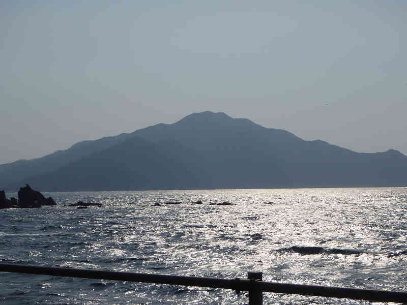 遠岳山の山頂風景 山頂からは平坦な大島などを眺めることができるが、当日はPm2.5の影響で展望は霞んでいた。旧海軍の石組みは依然として残っているが、山頂付近には雑木が茂り、前回来たときより賑やかになったような印象を受けた。