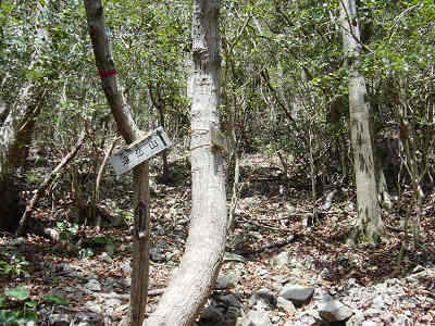 すぐ目の前の坂にロープが渡してあり、急な坂を登ってゆく。坂は木で補強された階段となっており、かなり手が加えられて整備されている。ロープを伝って坂を登ると左側に山頂まで20分の道標を見る。ここで先行者とすれ違った。本当に久しぶりに登山者と出会った。登山者と会ったのは周東町の大黒山以来ではないか等と考えながら進む。しばらくはなだらかな坂を歩くが10分もしない内にコースが分岐し一方は北にまっすぐ登る近道コース、もう一方はゆっくりコースである。当然近道コースのガレ場を登ってゆく。