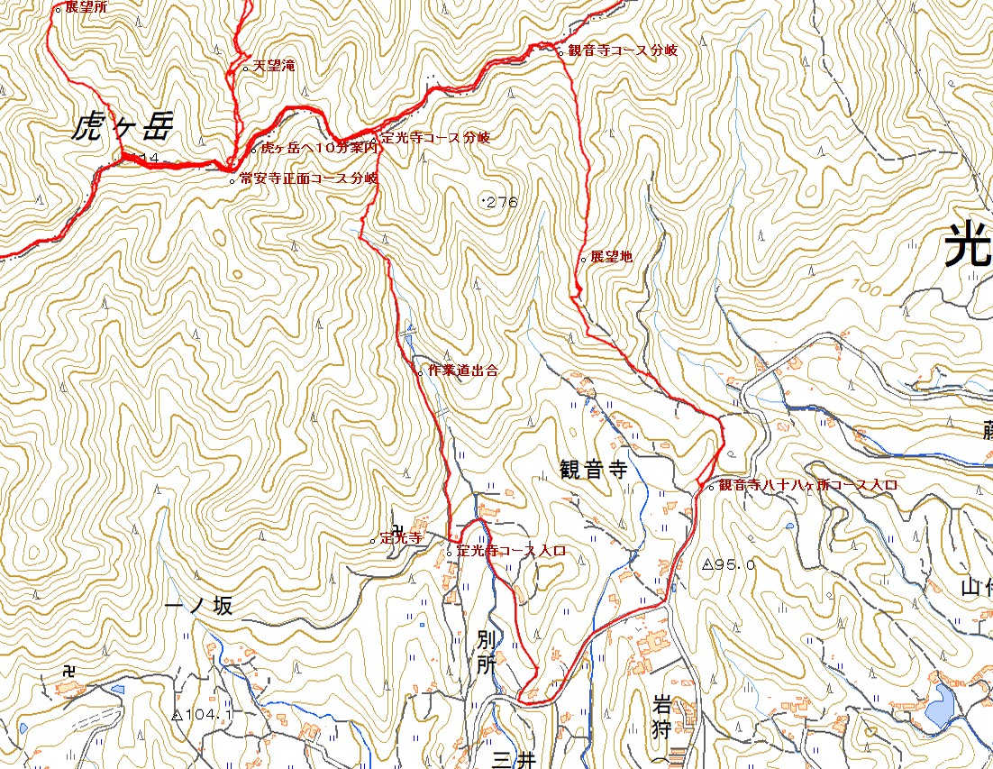 トップに戻る 2015年に登った山リストへ戻る 山名アイウエオ順 2002年 6月 2日 定光寺コースを見る 2015年12月2 6日観音寺八十八ヶ所コース登山口 →0:28→ 縦走路出合 →0:23→ 虎ヶ岳山頂 →0:12→ 定光寺コース下山口 →0:14→ 作業道出合 →0:05→ 定光寺前 →0:18→ 観音寺八十八ヶ所コース登山口 全歩行時間 1時間40分 竜ヶ岳主尾根コースの整備を終えてまだ午後3時前、天気は回復に向かいそうなので引き続き光市虎ヶ岳の観音寺コースへ向かう。観音寺コースの登山口へ向かう起点を光市役所三島出張所とすれば、出張所前から北へ進路を採り、信号を直進して岩狩団地を抜ける。 この先に老人施設の光苑があり、この前を通過して道なりに北へ進むと、主路は右へ向く。ここで左側に気をつけていれば、虎ヶ岳観音寺八十八ヶ所コースの案内が見えてくる。駐車場はもう少し先の貯水タンク右側にあるので登山口を少し過ごす感じである。