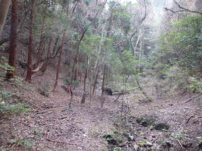 こんな時、定光寺への案内が要所に配置されているので励みになる。斜面を下れば谷に着き、足下には石組みを多く見る。この付近は昔隠田だったのかも知れない。急な斜面にはロープが渡してあり、とても助かる。
