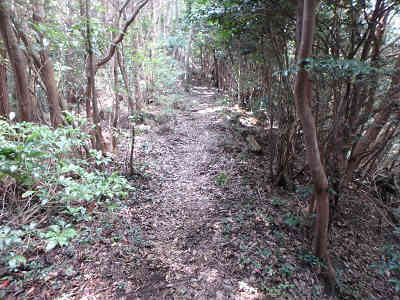 石仏に見守られながら信仰の道を辿り、巡拝路の最高点で小休止。石仏の写真を撮り分岐を通過し少し坂を登れば右手に小周防方面の展望が広がる。この先には左右の分岐があり、右が急登、左は緩やかな巻き道である。いつものように右の急登の道を採り、一気に高度を上げる。そのまま頭上に樹林を眺めながら明確な道を進むと間もなく渓月院から続く縦走路へ出た。以前は案内標識がしっかり置かれていたが、現在は足下に転がっている。