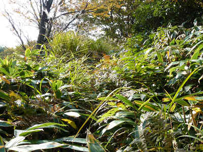 この山は個人の持ち山ということから、入山を許可していただけるだけでもありがたいことである。広い山頂にはススキが風に揺れており、しばらくススキと笹の美しい山頂で小休止、山頂周辺にも紅葉の始まりを見つける。その後山頂を出発、気持ちの良い木漏れ日の中、往路を引き返す。やがて登山口の駐車場まで到着、無事栃山への登山を終了した。