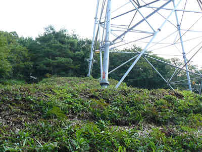 目の前に岩が現れてくれば、少し坂の傾斜が緩む。もう少し進めば最初の鉄塔の下に到着。ここまで登山口からは400m、山頂までは残り1600mである。鉄塔下の笹はよく刈られており、鉄塔広場は整備されている。ただし、鉄塔広場からの展望は、向かいの山が見える程度でこれ以外の展望はない。