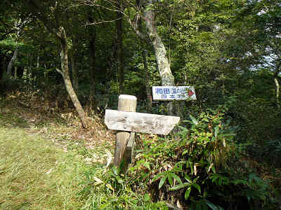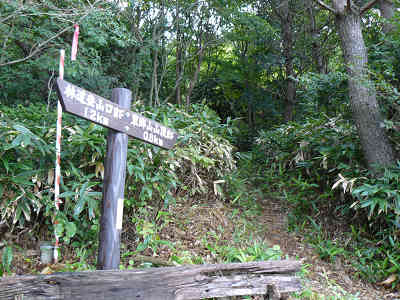 山頂からここまでは誠に快適な気持ちの良い縦走路だったが、これから先は少々荒れ加減の道に変わる。背の低い笹の道を下りて行くと、足下の道は少しずつ狭くなる。更に下りて行くと、手製の案内標識が現れ、更に左方向に下るよう案内してある。この先にも続けて2ヶ所の案内板があり、更に下る。