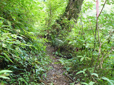 鉄塔の奥からは更に登山道が続き、少し進めば再び急な坂道が始まる。尾根沿いの坂道は、坂の傾斜が一時的に緩くなる場所もあるが、ほとんどは急な傾斜が続く。しばらく辛抱して坂道を登れば、周囲に笹が目立ち始める。
