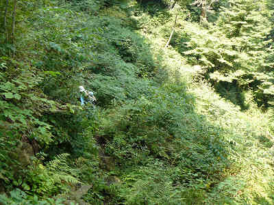 歩くスペースが狭くなり、足下には滑り易い岩が目立ち、滑らないよう細心の注意を払いながら下る。周囲には杉の大木が目立ち、眼下に広がる景色は美しく、しっかりと足場を確保して周囲の展望を眺める。手当たり次第に草や樹木を掴み、安全に細心の注意を払いながら急な斜面を下る。