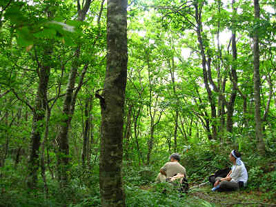 急な坂道を登り返しながら背後に広がる等検境はとても美しい。間もなく樹林の中に入り、954mピークの分岐付近まで戻ると、とても涼しい風が吹いているので小休止。まるでエアコンの中にいるような涼しさに感激した。