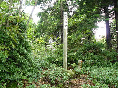 岩の場所を通過する 山頂三角点付近からは南東方面のみが開けており、新生坊峠がとても近い。山頂から少し西に向かえば素晴らしい展望地。新生坊峠から大万木山、沖の郷山・三瓶山まで見晴らすことが出来る。