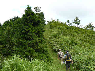 目の高さの等検境 斜面をジグザグに折り返しながら下りて行くたびに当然ながら等検境の山頂が高くなる。背後を振り返れば緑の絨毯の登山道を一気に下りてきたことが分かる。周囲を眺めれば、進行方向右手は草原、左手は檜の植林帯と対照的な景色が続いている。