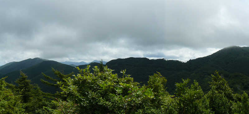 樹林の下の平坦な道を進むと間もなく緩やかな坂道となるが、やはり周囲には涼しい風が吹いている。少しずつ坂を登って行くと登山開始から15分で等検境展望台に到着、南に大万木山、南西に琴引山、西に沖の郷山、沖の郷山の左に大江高山火山群、右手には三瓶山まで眺めることが出来た。
