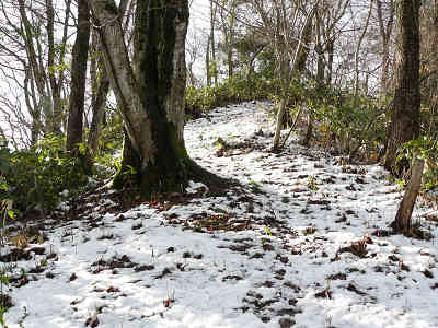 農道の端に車を置き、祠のある場所からイノシシ除けの扉を開け、登山を開始する。左に祠を過ごし、軽トラックの進入できそうな広い道を進む。すぐにT字路に着くので左折する。この分岐を右に採るとやはり農道に下りることができる。広い未舗装道には、雪が残っていた。植林帯の下に暖かい日差しは届かず、昼でも雪は溶けないようだ。